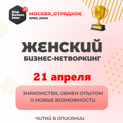 Милые дамы, приглашаю вас на нетворкинг-встречу 21 апреля! В этот день перед вами откроются новые возможности проявиться, рассказать о себе, о своем любимом деле. Найти новых партнеров, клиентов, друзей и поддерживающее окружение. А так же вас ждет интересный спикер с экспертной темой выступления: невероятный формат отдыха, который подарит вам яркие впечатления! Предлагаю встретиться, обменяться опытом, вдохновением и внутренней силой, которую дарит женская поддержка.