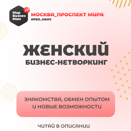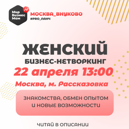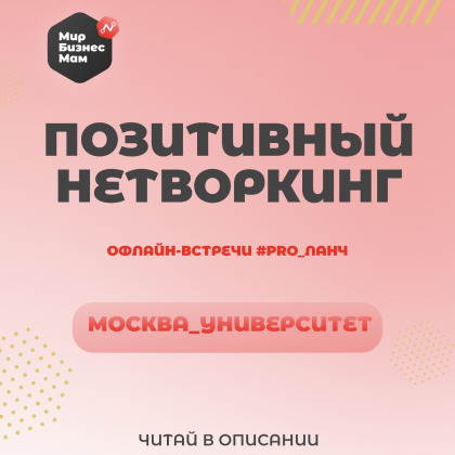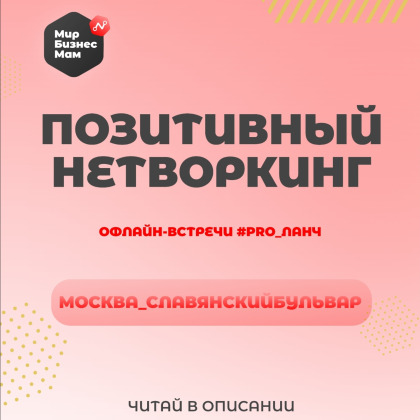 Прекрасные девушки 🌹 Приглашаю вас на особую бизнес-встречу #pro_ланч_Нижний_центр от женского нетворк-сообщества Мир Бизнес Мам В программе встречи: 🌟обязательно нетворкинг ,где абсолютно каждая участница - супер звезда 🌟Фотосессия от профессионального фотографа 🌟РАССЧИТАЕМ «КОД БОГАТСТВА» У каждого человека существует свой персональный «КОД БОГАТСТВА» -он заложен в дате рождения. Если знать свой «КОД БОГАТСТВА» и соблюдать ряд несложных рекомендаций, можно здорово улучшить финансовое положение. 🌟Возможность добавиться в наш большой Позитивный чат ( более 3500 участниц) , где вы так же расскажите про себя и свое дело Настало время заявить о себе и начать проявляться !
